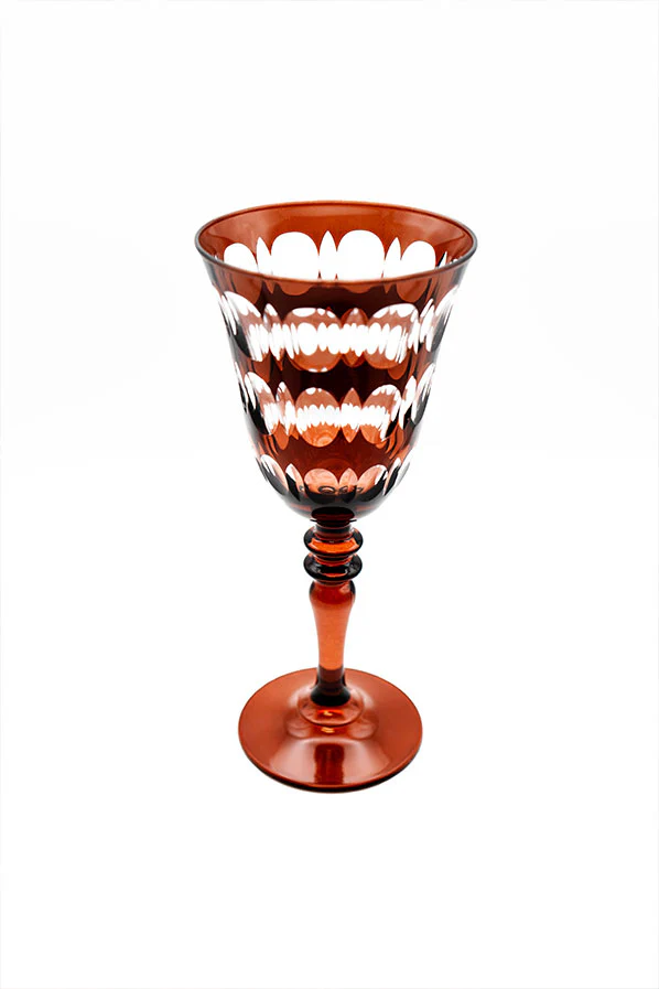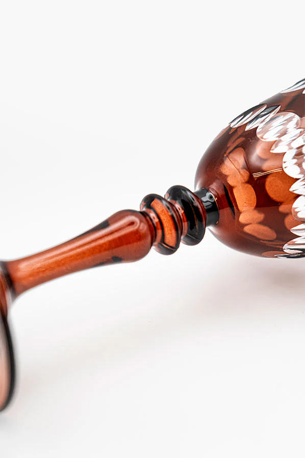 Copa alta tallada con un diseño único. En tonos marrón chocolate, junto con su pie de color, hace que sea una pieza única. Su diseño único y atemporal convierte cualquier mesa en una escena digna de portada.