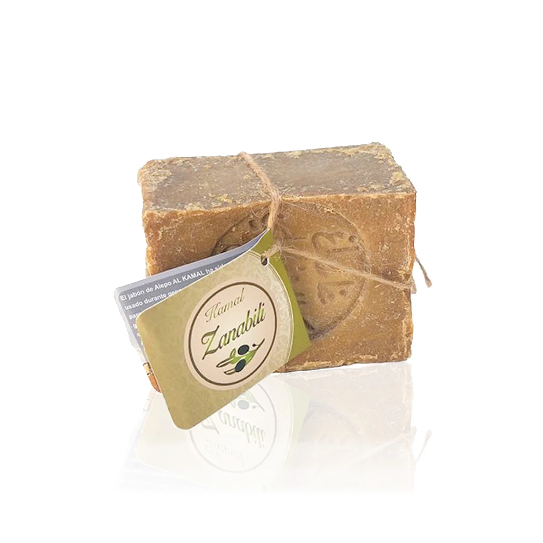 Jabón de alepo elaborado de manera tradicional siguiendo la receta milenaria tradicional y natural a base de aceite de oliva y aceite de bayas de laurel por la familia jabonera siria Zanabili. Nutre y regenera la piel de forma natural.