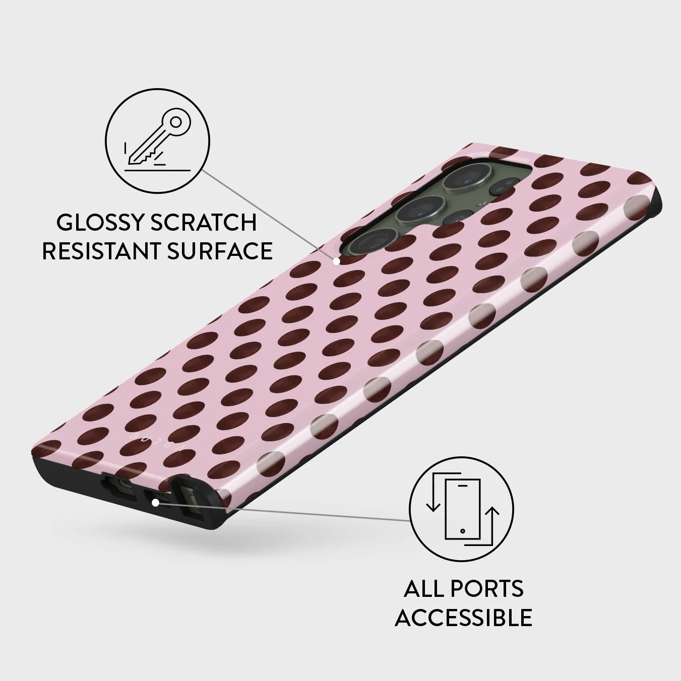 En este diseño: patrón retro de lunares, fondo rosa, lunares marrones