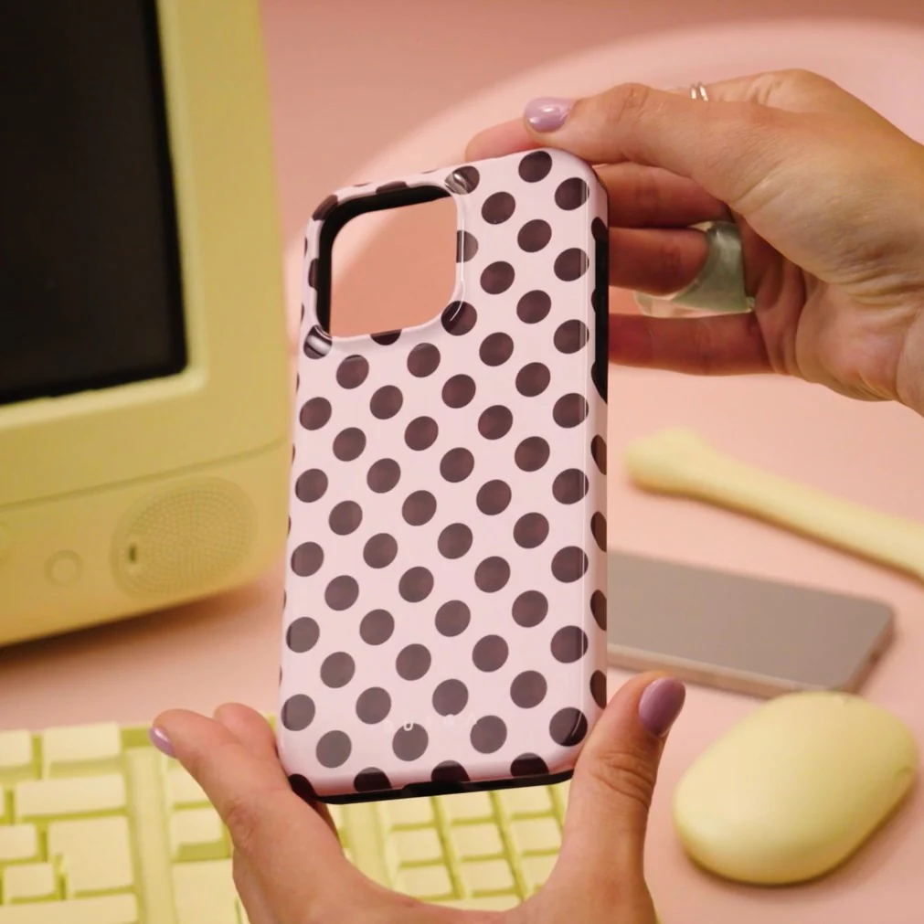 En este diseño: patrón retro de lunares, fondo rosa, lunares marrones
