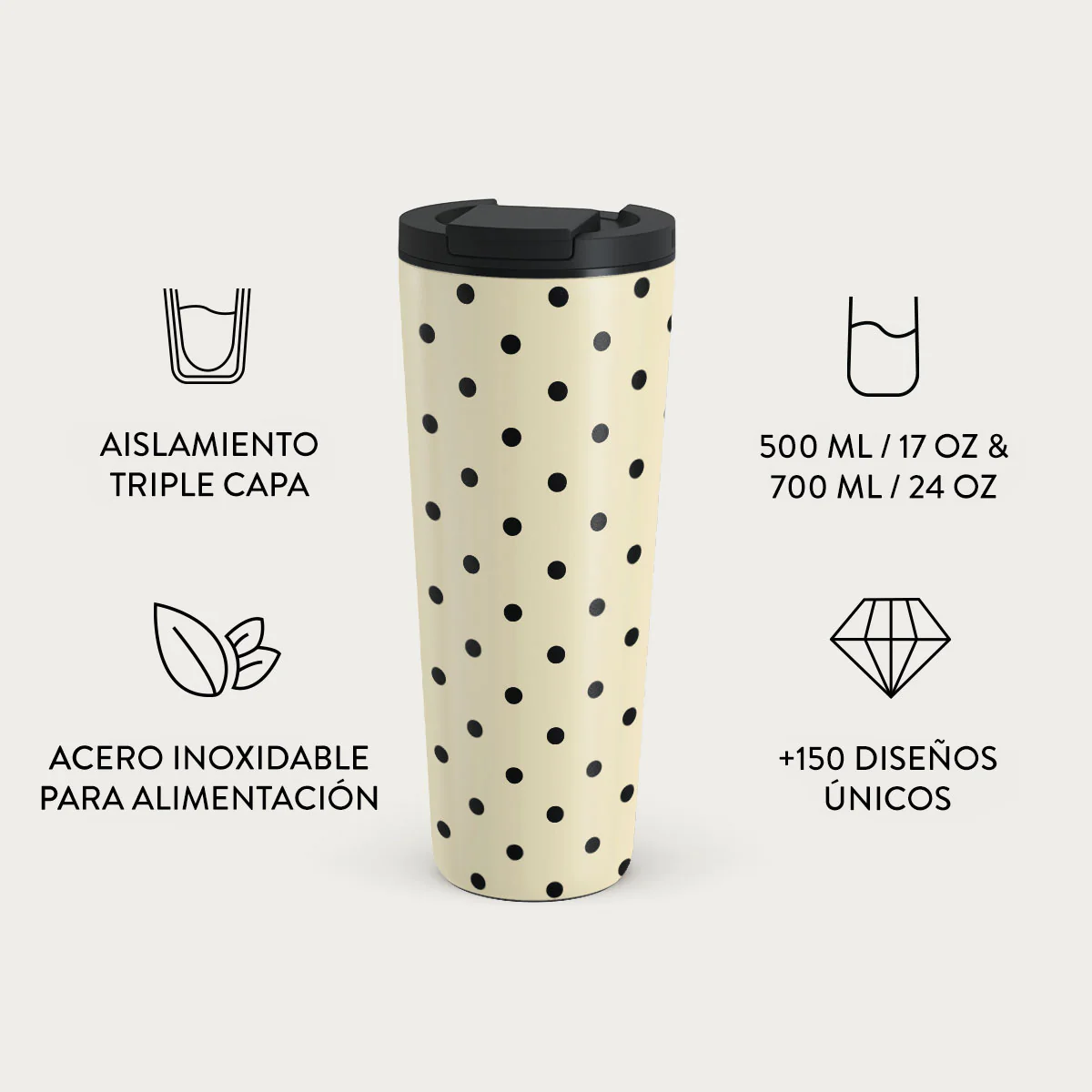 - Termo 700 ml (24 oz.): Mantiene las bebidas calientes 6 horas y frías 24 horas.